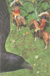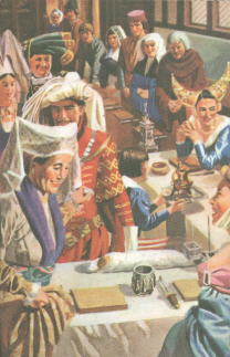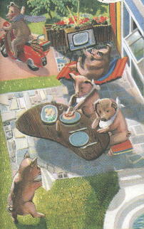 Hampson was born in 1918 in Manchester and as a child lived in Southport. At the age of 13 he entered a Meccano Magazine art competition, winning a prize and an invitation to provide commissioned drawings. His first job after leaving school at 14 was with the Post Office, spending any spare time there sketching on office stationary. In 1935 he was asked to contribute to the GPO magazine and his first 4 frame cartoon appeared there that same year. His burgeoning talent was spotted by a T U officer who suggested Frank try for Art College and in 1938 he enrolled at Victoria College of Arts and Science. Frank was called up at the start of the war and later was sent to Dunkirk. He saw action in Normandy and the Low Countries. After the war he resumed his art education at the new Southport School of Arts and Crafts. He then went on with his fellow student Harold Johns to found a Commercial Art Partnership to supplement their incomes. In the late 40s Frank struck up a friendship with a Southport vicar, Marcus Morris, who requested Frank's input in the parish magazine. Later they would produce the highly successful Eagle comic with Frank as illustrator in chief. In doing so Frank became increasingly interested in children's comics, collating examples from the best such as the Dandy, Film Fun and Adventure as well as American and Canadian picture pulps. Frank then established an artist's studio in Southport. "The bakery", no more than a run-down shed. It did however provide the workers with a glass roof for a nominal rent. Frank's pivotal involvement with the Eagle is a most interesting part of his career *. However to describe it here in detail would, I fear, digress from his Ladybird work. Suffice to say that Frank was well versed in the genre of art for children when he started to work for Ladybird (then known by their publisher's name of Wills and Hepworth). His experience during the war also undoubtedly influenced his images. Hampson first worked for Wills and Hepworth during the decline of The Eagle. He was obviously a good name to have with such a reputation and yet it seems his full potential was squandered as he illustrated so few titles. Soft Humour is prevalent in Hampson's work, most evident in the Nursery Rhymes series. However gentle playfulness can be found in the more factual works too, such as the rather ropey riding of a penny farthing in Transport Through The Ages. A study of the facial expressions of many of his characters exposes a sense of fun. Their over-acted response, akin to music-hall comedy, tied in with the often lavish costumes of the historical character, gives the work a real sense of theatre. In contrast to the jovial moods portrayed, there lurks a darker take. Examine closely the pensive mood of the admonished - and in the Nursery Rhymes there is often a sense of creeping menace and punishment. A sense of deep resignation appears on the faces of many historical players and re-examining the happier expressions give one a sense of propagandist posturing - "It's alright, boys" as the legion marches off to their fate. And see the slightly pained smile of Queen Matilda being led down the aisle. Historically there is great licence in representing historical facts that we know to be chestnuts - King Canute is given a Pythonesque interpretation, Medieval Banquet scenes are given a nice middle-class sense of decorum and cleanliness. And a surprisingly enthusiastic embrace of Darwinism gives us a scene out of Planet of the Apes as representing early human hunter-gatherers. This was certainly a more attractive method of giving history to children. Unfortunately this legacy of extending the boundaries of truthfulness is with us still today and the aphorism that only winners write history is maintained. Historical and moral allegory abounds of course in the Nursery Rhymes series. I mentioned before the possible reference to Mary Queen of Scots in the Mary, Mary rhyme. There are many more which Mr. Opie could elaborate on - what Hampson does is to perfect a visual interpretation into a distinct style which makes wonderful use of character, costume and colour. Fantasy is clearly an important element in Hampson's ouevre. Heightened colour, exaggerated expression and original composition dictated heavily by unusual perspective are Hampson's trade marks. There is often a sense that we are looking in on a dream-like tableau, that the characters within the scene are not aware of being observed and yet their gaze can even appear to fall towards us. The perspective can make us feel giddy as we look down or up at scenes normally viewed straight on at eye level. The viewer shrinks to a field-mouse or we are transformed into a looming giant so that we become the make-belief looking in on normality. Distortion of Scale is often deployed to throw off our sense of reality. And then there is the improbable put into a real enough setting or indeed the other way round. Hampson throws in decoys that take us to the edge, and then with an array of colour and shape so pleasing to the eye spins us back into the heart of the image. | ![]() Medieval banquet Through the ages: Food Two fine examples of vertiginous perspective: ![]() Third Book of Nursery Rhymes ![]() First Book of Nursery Rhymes |